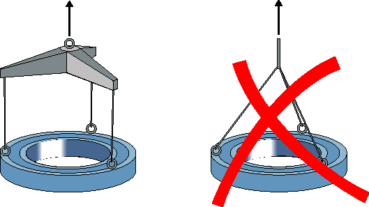 Para facilitar su elevación, los rodamientos grandes se pueden equipar, a petición, con orificios roscados en las caras laterales de los aros, para incorporar unos cáncamos. El tamaño del orificio está limitado por el espesor del aro. Por lo tanto, sólo se permite elevar los propios rodamientos o los aros individuales por los cáncamos. También se debe comprobar que los cáncamos estén sometidos únicamente a una carga en la dirección del eje del vástago (fig 2). Si la carga se va a aplicar en ángulo, se requieren unos mecanismos de fijación adecuados.